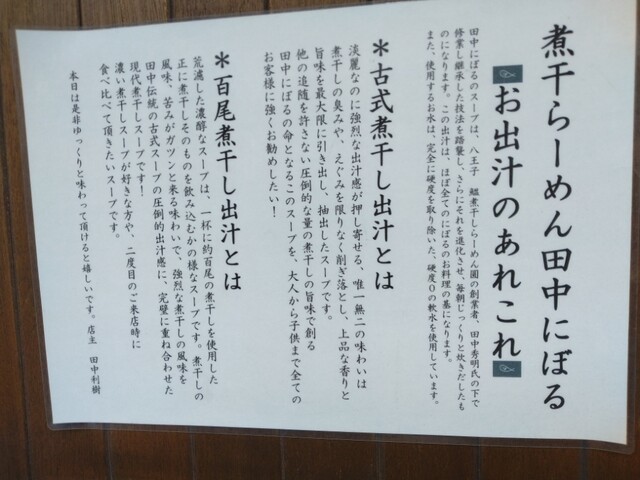 途中から田中にぼるの特製にぼりを追加、にぼりはイワシ煮干しと様々な食材をゆっくりと時間をかけて煮込みペーストにしたものだそうです。1分から10分まであり、にぼりナナブでお願いしました。丼をカウンターに置き、店主さんににぼりを7分入れてもらいます。スープに溶き入れると、濃厚な色合いに変わりますか、苦味はなく煮干しの風味が増しました。たいへん美味しかったです。ごちそう様でした。