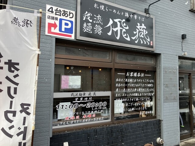 当然の如くお腹は減っているので、宿舎からクルマで移動。予想よりも30分以上早く出られたので、まずは第一目標である飛燕さんへ向かいますが、10時半過ぎには到着し、所定の場所にクルマを駐めて待つことに。10分前になると別のクルマがやってきたので、軽く雪が舞う中ではありますが店頭で暖簾が上がるのを待ち始める。