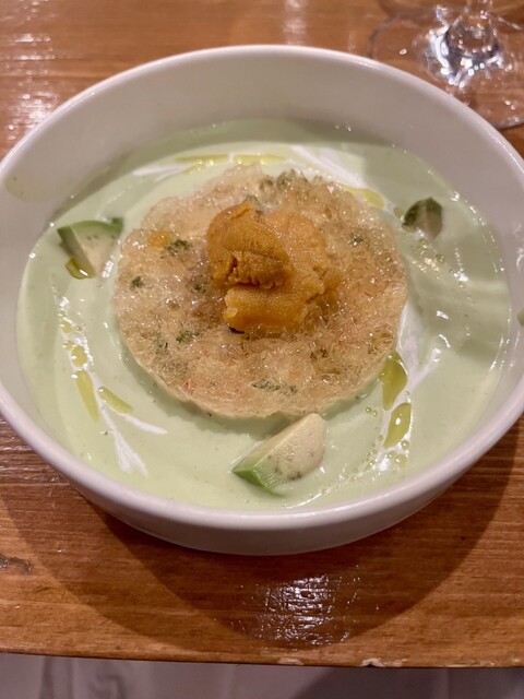 前菜はズワイガニとウニとアボカドを使った一品。蟹の味がしっかりして、ウニもたくさん乗ってて嬉しい!ソースが素晴らしく、スプーンで掬って完食!