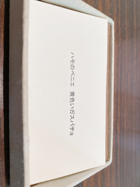 料理が提供される前にカードに書かれた食材メニューを見ながら料理を待つという他にない斬新な楽しみ方ができます。※食事が運ばれてくる前に一枚一枚めくってくださる。