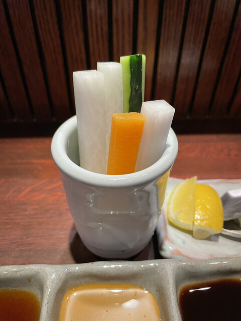串カツ提供の際、それが何の串カツかの説明はなくその串に合うソースの説明のみで中身は食べてからのお楽しみだそう。食べれても分からない場合は聞いてください!笑