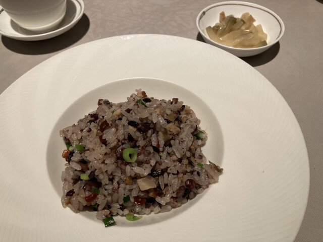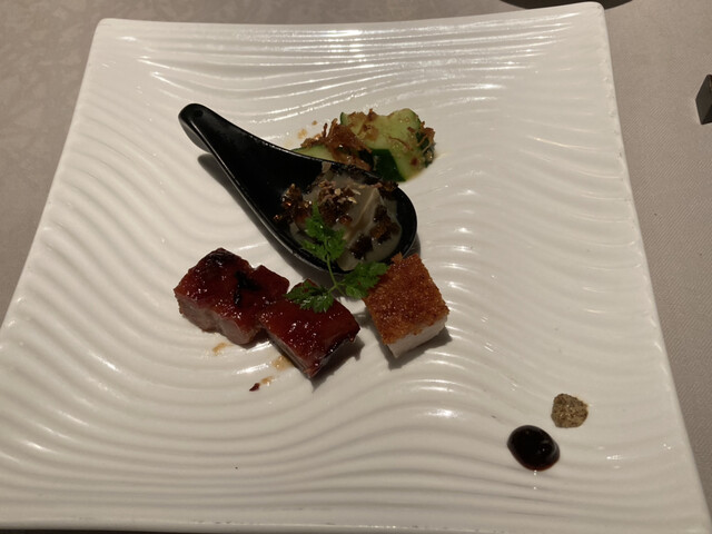 前菜 茄子と桜エビの和物、ピータン豆腐と胡麻ソース、チャーシュー