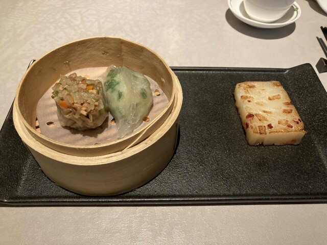 右から大根餅、蒸籠の中には雑穀米の焼売、ニラエビ餃子