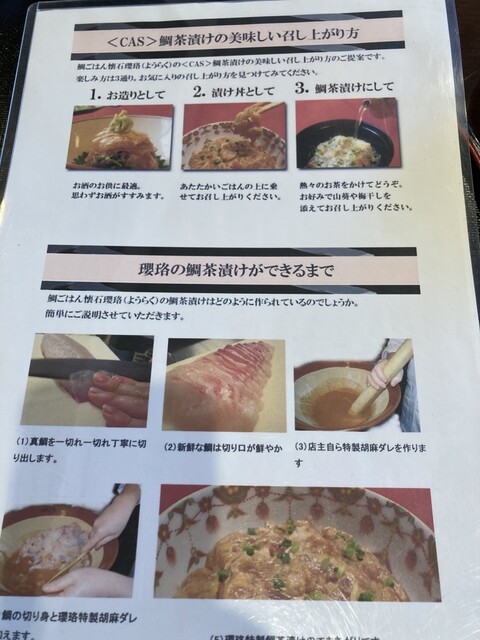 ①近隣の小田原産の鯛を薄く切り店主自ら挽いたすりごまから作った特製のごまだれにまぶしだものをそのままいただく。②鯛めしの上に乗せて丼としていただく③鯛めしの上に乗せて濃いめの緑茶をかけていただく。