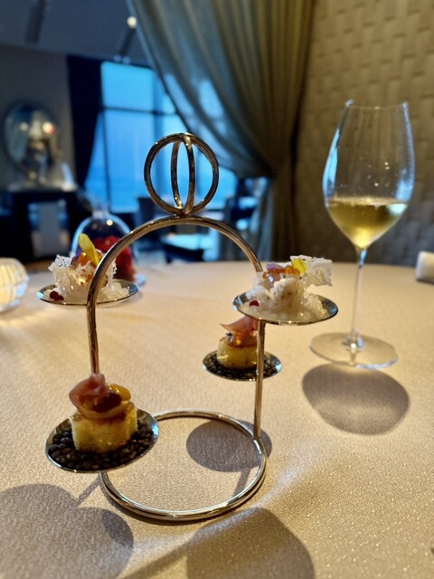 月に何回かの特別コースがある日で、前菜は定番のキャビア×かにのジュレ。これがどうしても食べたくて。金属の味が映らないよう貝のスプーンまで用意されていて、これがアミューズなんて!!