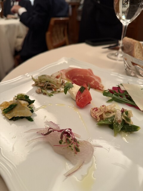 コース12,000円をオーダーしたので、冷前菜、温前菜、パスタ2種、メイン、デザートを堪能。