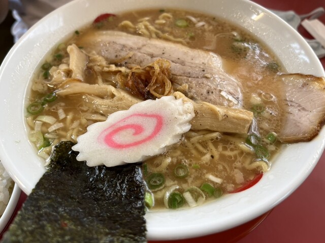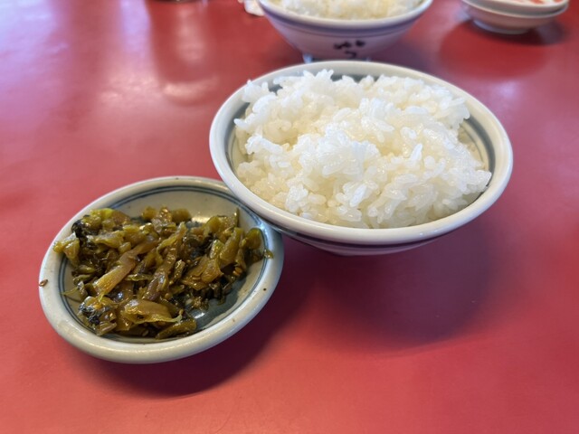 サービスのライスと高菜漬けを先に食べてると、ラーメン到着!