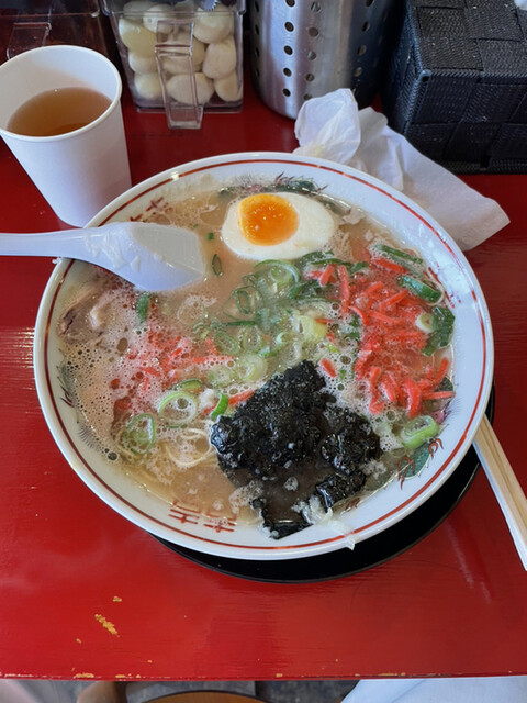 久しぶりに長浜ラーメンが食べたくなりましたが、お気に入りは東大和の大学ラーメン、六町の田中商店でちょっと遠いなあと探してみると高円寺にあるでは無いですか。これはちょうどいいぞってことで12時のオープンに向けて車を走らせます。前情報がなかったので連休中ですんなり入れるだろうと思っていたのですが甘かったですね。店内5人待ちの次に外のイスに着席、混んでた。でも長浜系は提供が早いからなあと待っていると皆さん「替え玉」っとかけ声。それでもやはり回転早くどんどん進んでいきます。10分も待たずに案内されて水とレンゲ持ってラーメンをオーダー。硬さを聞かれないのでデフォルトでお願いしました。