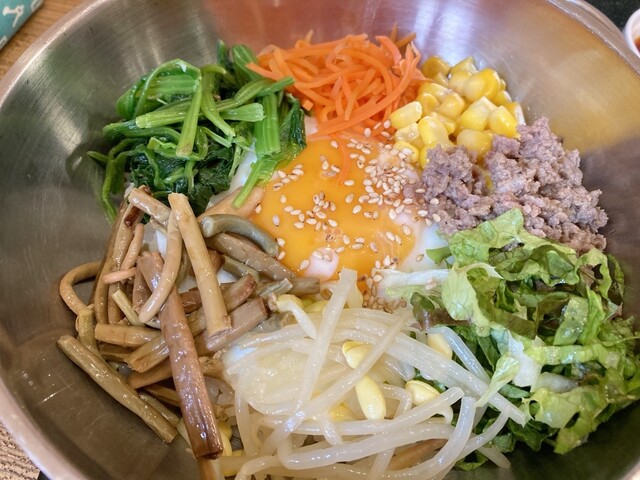 野菜不足感じてビビンバいただきにこちらへ。奉還町商店街でてすぐの人気韓国料理店です。辛い味噌と辛くない味噌と両方つけて出してくださいます。野菜と山菜、目玉焼きがカラフルで食欲そそります。食後にはランチ限定の甘いインスタントコーヒーをお願いすればサービスでいただけます。美味しかったです。