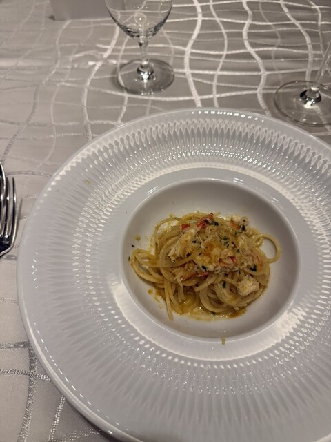 オシュトラキャビアスティックから始まり、中トロのメニュー、三年とらふぐの白子のフリットと月光というゆり根を合わせた一品、パスタはタラバガニとボッタルガ、黒鮑のお皿が続き、三年とらふぐと生ハムの創作料理、近江牛ヒレに削りたてトリュフ!