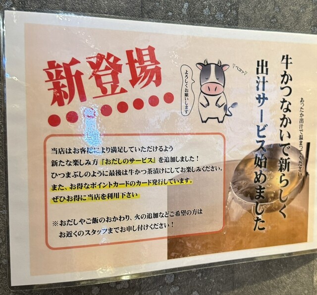 ランチに伺いました。宇都宮で牛カツ、今まで気が付かなかったお店です。早々入店。直ぐにテーブル席に案内されました。メニューをチェック。牛かつ御膳の130g、おすすめに決めてオーダー。まだかなと思ってると来ました、思ったより早いです。牛かつの中程が開いて向いてます。レアでサシがたっぷり入ってます。衣は薄いです。先ずは牛かつだけを頂いてみます。柔らかいです。脇の小さな焼き板にちょっと乗せてお好みにまし焼きして今度は善に付いてるソースにちょっと付けて食べてみました。これはご飯に合いそうなので合わせてご飯も。ジューシーで美味しい。テーブルに有るソースや醤油、岩塩なども使いながら食べ進みます。私は岩塩が気に入りました。そして壁にアピールしてあった出汁サービスを利用して最後はひつまぶし風に頂きました。楽しく美味しく頂きました。美味しかった。ご馳走様でしたありがとう