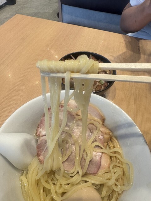 お昼頃お邪魔しました。気になってたお店です。昆布水が気になってました。入店して食券を買うシステムです。ひと通り券売機のメニューを見定めて、やはり特製つけ麺、昆布水掛けの、塩を選びました。お昼時ですがラッキーな事にテーブル席にすぐに案内されて着席、食券を出してオーダー完了です。何人かが着丼待ちでしたがそちらが済むとすぐに自分のオーダーも着丼です。麺とつけだれの椀。麺が昆布水浸かってます。先ずは昆布水と麺を頂いてみます。麺は中太平打ち麺、昆布水はあっさりとしながら風味を醸してます。なので麺の小麦の味を感じます。そして次に鳥出汁のつけ汁に通して頂きます。これも鳥の出汁が効いててそれを塩が包む感じで美味しい。チャーシューも豚と鳥。楽しく、美味しく昆布水につけ汁を少し足して麺と頂く。色々に食べられます。美味い。どんどん食べ進んでしまいましたー。美味かった。ご馳走様でしたよ