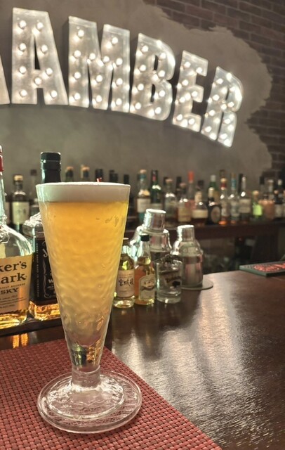 バーといえば壁一面にウイスキー等の瓶がずらりと並んでいるイメージですけど、壁から飛び出したかの様な「CHAMBER」の文字が印象的ですね。