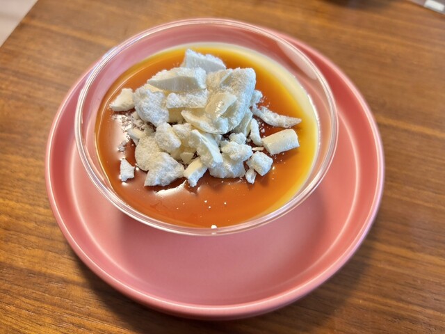 カラメルソースとメレンゲが付いていて、メレンゲは好きに割ってトッピング。