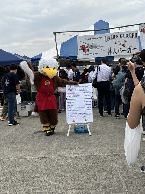 日本でハンバーガーを食べる事はほとんどないが自分はアメリカの牛100%の肉肉しいハンバーガーが好きだ。と言う事で久々に横田に行ってみると9時過ぎにも関わらず外人バーガーは大行列にビックリしビールと他の店のハンバーガーを買って食べたがパティは日本のハンバーガーの様なフワフワ?で牛の旨さはまったくなく合い挽きか豚メインで数口食べた時点で大行列を諦めた事を後悔しビールを持って大行列に。約40分並んだが炭火で焼かれた牛のパティを見た瞬間これこれ、食べる前から美味しいのがわかり自分でケチャップとマスタードをかける(自分はケチャップ少なめマスタード多め)以前はレリッシュもあったがなかったのは残念だったが炭火で焼かれたパティとバンズとケチャップとマスタードだけのハンバーガーは肉肉しく最高に美味しかった。