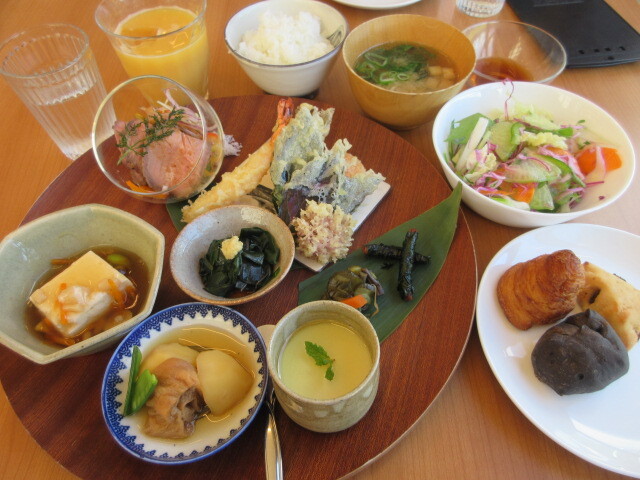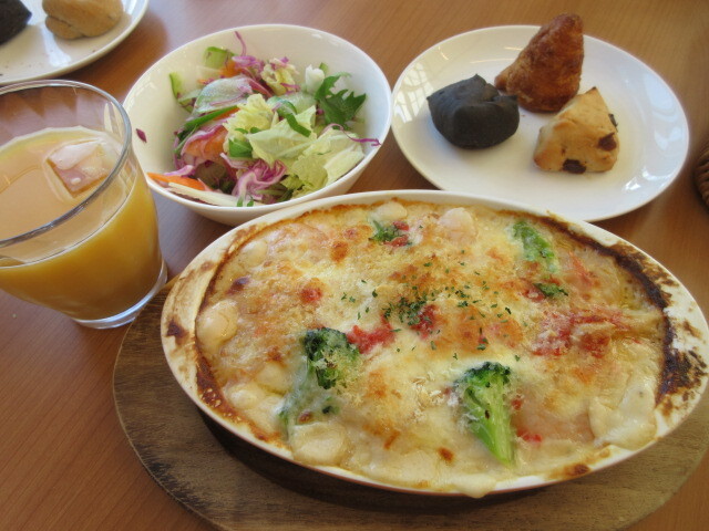 パン食べ放題を付けた、なないろプレートと、海老と野菜のクリームドリア