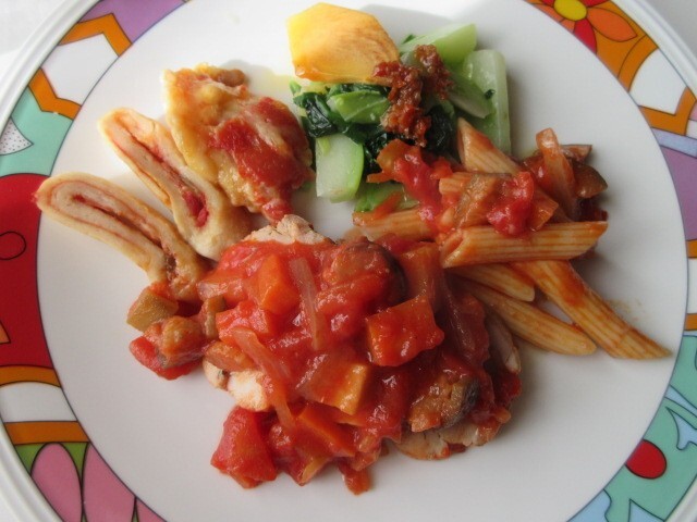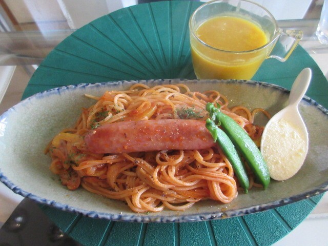 デザートとコーヒー付きイタリアンランチ1,000円。パンチェッタの鶏肉巻き、自家製ベーコンのトマトスパゲッティを注文