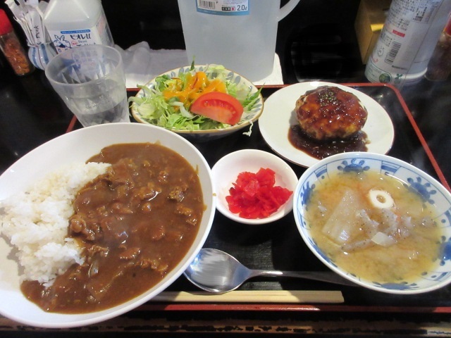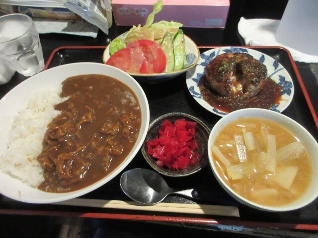 本日のサービスランチメニューは、チーズハンバーグなどが付いた、旨辛ビーフカレー定食