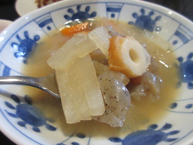 味噌汁は、ちくわ、大根、にんじんなどが入った具だくさん
