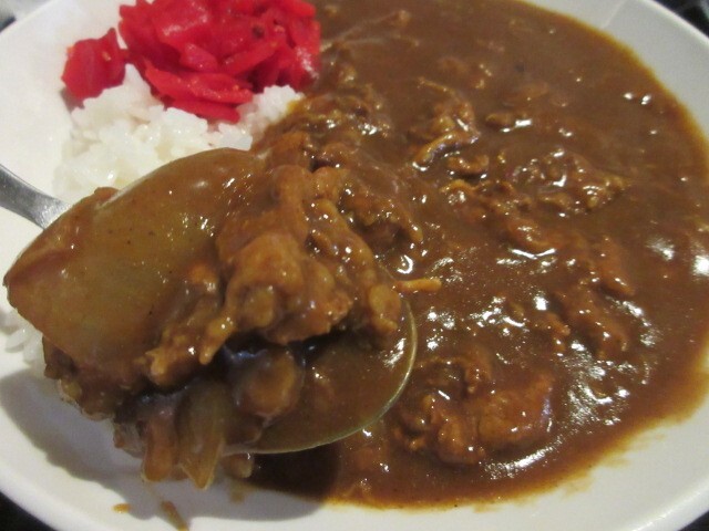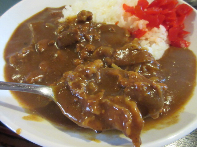 本日のサービスランチメニューは、チーズハンバーグ付き旨辛ビーフカレー定食