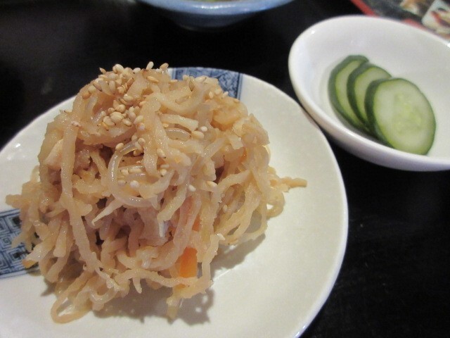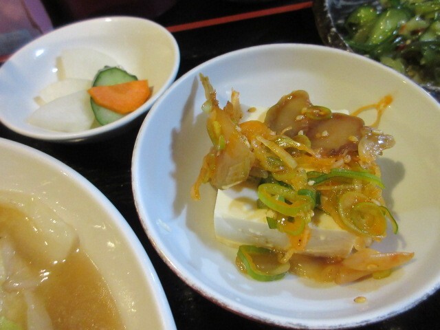特製よだれ鶏などが付いた、天津飯醬油あん定食、鶏出汁野菜汁