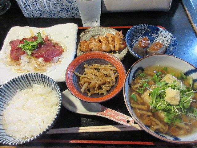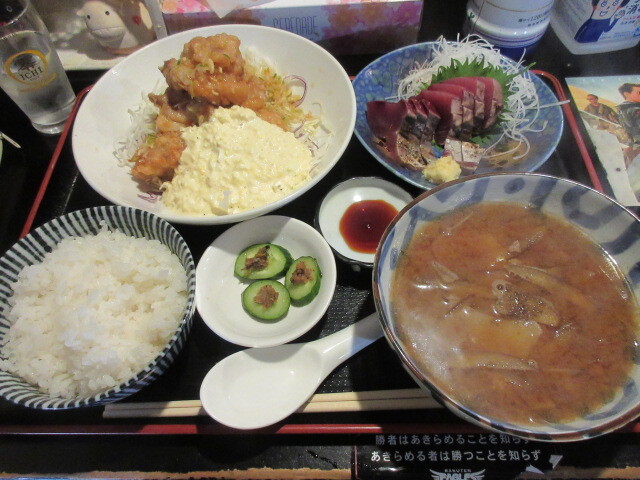チキン南蛮、初かつお刺しなどが付いた、肉そぼろ旨味噌野菜汁定食