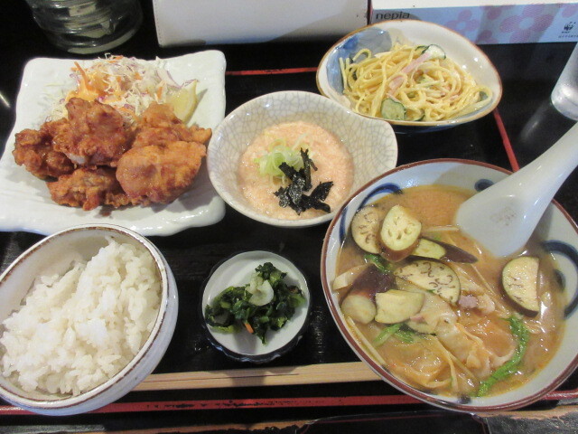 豚肉、茄子胡麻みそ汁定食 850円。12か月さんのランチはおかずが多くておなかいっぱいになるので、今回もご飯少なめにしてもらいました。豚肉、ナス、キャベツ、水菜入りで、ごま風味のコクのある具沢山味噌汁がメインです。味噌ラーメンのスープみたいな味でした。唐揚げは注文後に揚げるから熱々で、しっかり下味がついていておいしい。明太とろろをご飯にかけてみました。とろろ多い~。スパゲティサラダ、漬物も付いておなかいっぱいに。