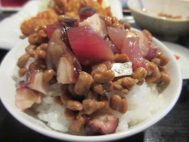 海鮮納豆は、まぐろやたこなどの刺身と納豆の組み合わせです。ご飯にのっけて食べたらご飯足りなくなった~。