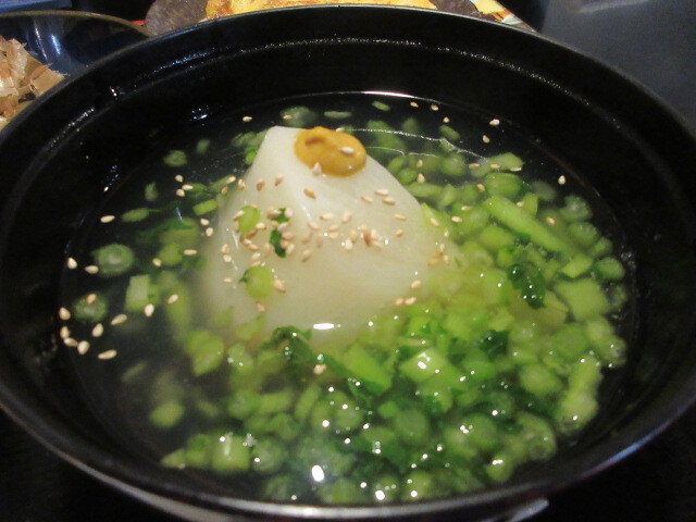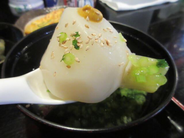 から揚げは大きめのものが5個も。ふっくらジューシーでおいしい!たっぷりのマヨ添えなのも良い。カブのあんかけ汁は、カブの葉がいっぱい入った、上品な味のとろみのある汁に、大きめのカブがどっかりと鎮座しています。ナスとブロッコリー、もって菊煮びたし。もって菊は食用菊のことで、おひたしや天ぷらなどで食べます。ちょうど今が旬です。気さくな居酒屋ランチで、季節を感じるお料理が味わえるってすばらしい。カニカマ玉子焼きは大きめで、卵2個は使ってそう。出汁がきいていました。