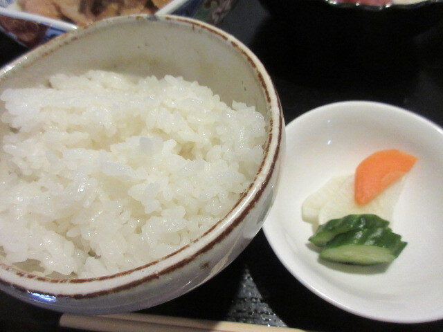 おしんこは、きゅうり、かぶ、にんじんの浅漬けと梅干し。この梅干しが肉厚で甘酸っぱくておいしいです。