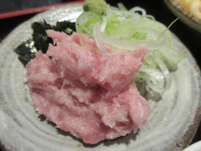 日替わりランチは、ねぎとろ刺、牛皿などが付いた、紅生姜揚げとちくわ天汁定食。