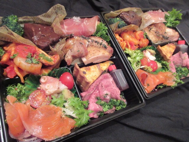 クリスマスオードブル1人前2,160円×2点。豪華で鮮やかですばらしい!直径20センチほどの器に、バラエティに富んだお料理の数々が盛り合わせてあります。