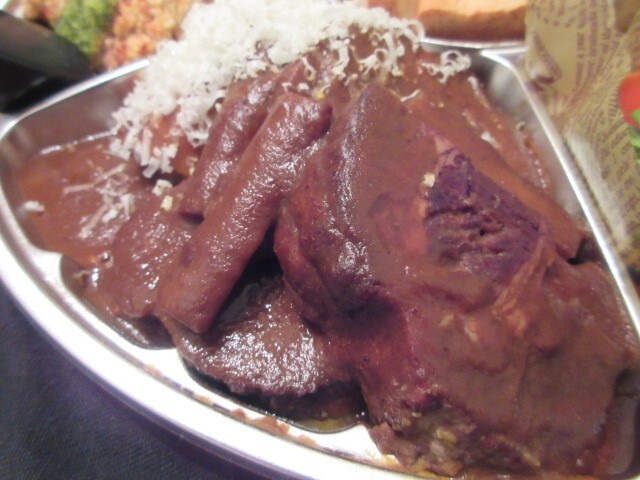 三元豚肩ロースの赤ワイン煮込みは、大きくてびっくり。約9センチ×6センチで厚みは2センチほどもありますが、フォークで簡単に切れるほど、とてもやわらかく煮こまれていました。隣にはジャガイモのアリゴ風が。ミルキーでやわらかいじゃがいもとの相性も抜群です。