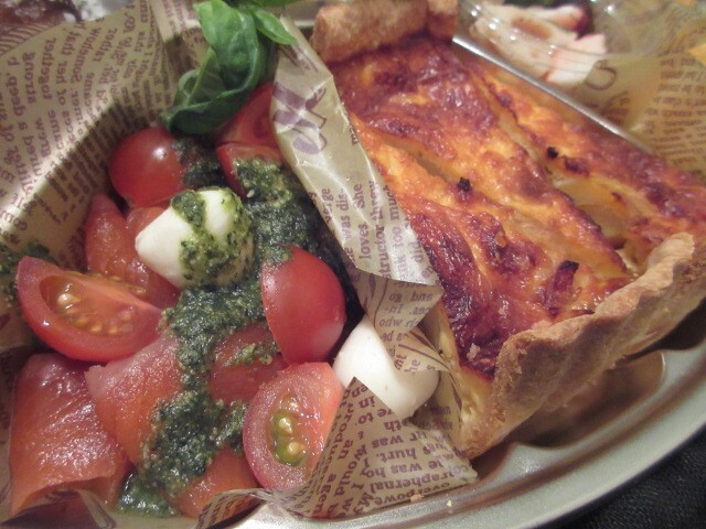 栗とベーコンのキッシュは、栗がごろごろ入っています。スモークサーモンのカプレーゼ仕立ては白ワインに合う~。