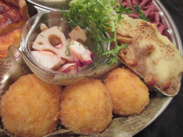 エビとホーレン草のアメリケーヌソースは、大きな海老とマカロニがごろごろ入っていて、海老の味が濃いソースをかけて焼いてあります。タコと蓮根のスパイスサラダ、ズワイガニと曲がりねぎのコロッケは初めてです。