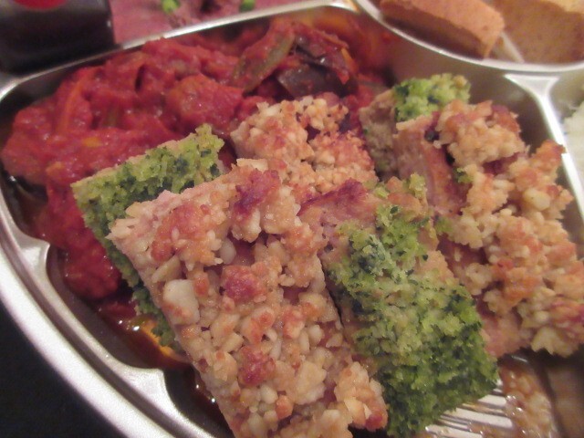 洋風松風焼きは、ひき肉にナッツや香草パン粉をのせて焼いたもの。野菜たっぷりラタトゥイユと一緒に盛られています。