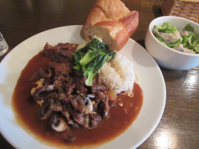 牛ホホ肉とゴボウのカレー850円 + キャラメルパフェ ランチにプラス200円。そう言えば、三日月さんで、ごぼうが入ったカレーを食べたのは、2020年1月で、2回目の訪問の時でした。その時は、ひき肉+豚もつ+ごぼうのカレーで、初めての組み合わせでとてもおいしかったのを覚えています。今回の、牛ホホ肉との組み合わせも初めてです。スパイシーで複雑な味わいのカレーに、旨みの強い牛ほほ肉とごぼうがとてもよく合っていておいしかったです。付け合わせはナスとピーマンのソテーとラッキョウです。