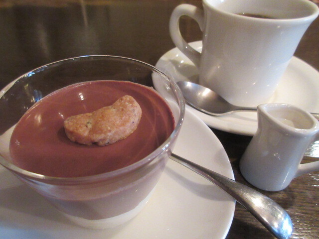 毎回楽しみなデザートは、今回はパッションとチョコレートのババロワ(ランチにプラス200円)でした。濃厚なチョコレートに甘酸っぱいパッションフルーツの組み合わせがgood。三日月型のクッキーがのっているのもカワイイ。ランチにセットのドリンクは、ホットコーヒーにしました。