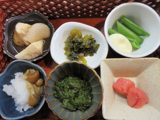 小鉢は、コロッケ、なめこおろし、めかぶ、厚焼き玉子、スナップえんどう、高菜の6品。日本酒が飲みたくなりますね。