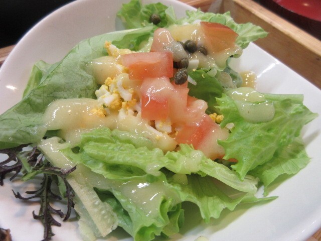 サラダは、前回と同じく、ケッパーと茹で卵入りです。前回は、菜園風サラダとメニューに書かれていたので、今回も菜園風かな。