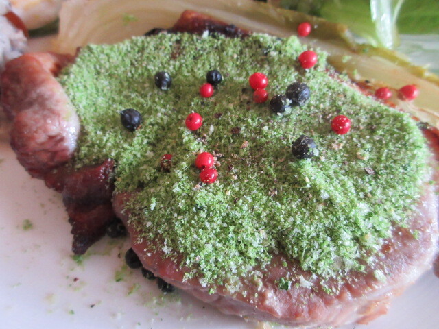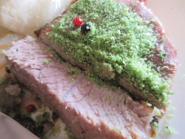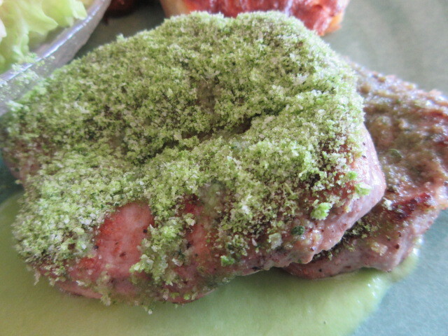豚ヒレ肉。上にのっているのはパセリで作ったそうです。下はグリーンピースのソース。