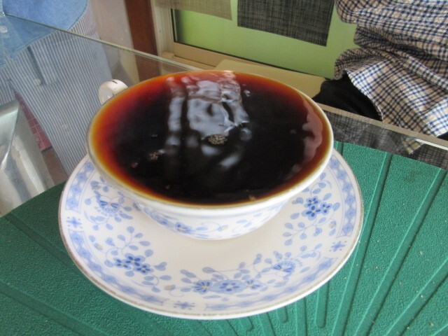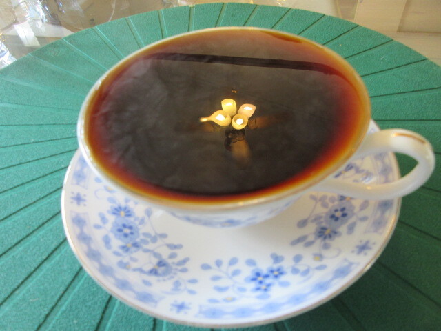 コーヒーはコスタリカで、もっきり酒のように満杯についでくれるのがインパクト大。コーヒーの表面に写っているのは、天井のライトです。紅茶は桜のフレーバーでした。