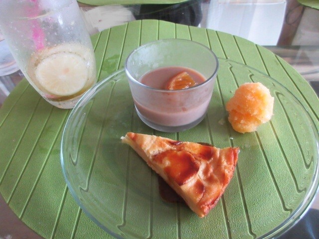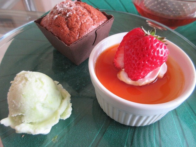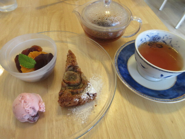 デザートも前回とは違っていました。紅茶のわらびもちは、紅茶の風味が強くておいしい。バナナのパウンドはしっとり濃厚。イチゴのジェラートはフルーティでした。
