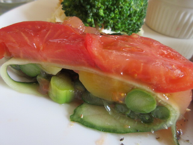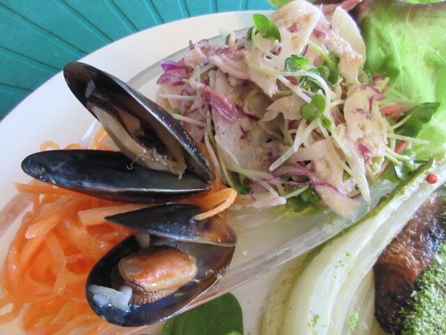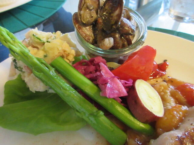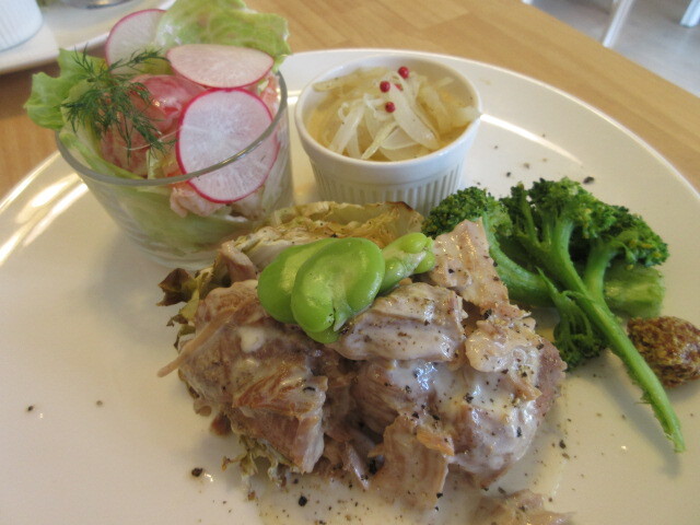 次は日替わりワンプレートです。美しい!メインは豚ヒレで、グリーンピースとレモンのソースにのっています。お肉を覆っているきれいなグリーンは、パセリで作ったそうです。やわらかくておいしい!