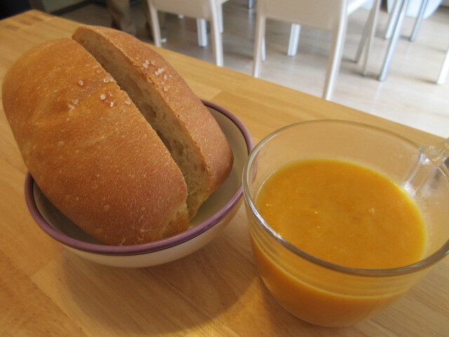スープと自家製塩パン。は、にんじんの自然な甘さで、もっちりした塩パンとよく合う!