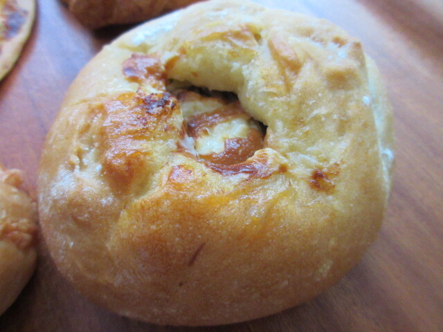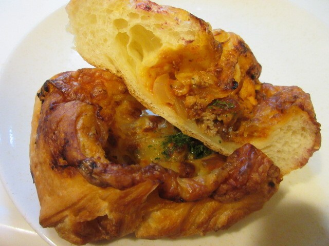 明るく気さくな店主さんがお出迎え。棚には自家製パンが並んでいます。後客が来る前に買っておきましょう。と思っていたら、さっそくパン目的のお客が来た。今回買ったのは、ミートソース、リンゴとクリームチーズ、アメリカンチェリーの3個です。どれも具材がたっぷりで、パン生地もしっかりした歯ごたえでとてもおいしい!