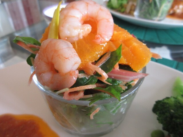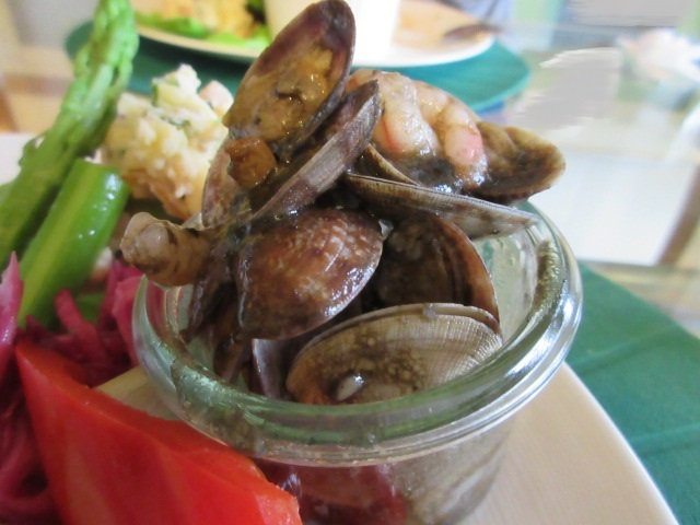 ガラスのカップに入っているのは、志津川のタコ、焼きなす、ごぼう、ほうれんそうをツナと白ごまで仕上げ、ざくろをトッピングです。この組み合わせ初めて。いろんな食感が楽しめます。