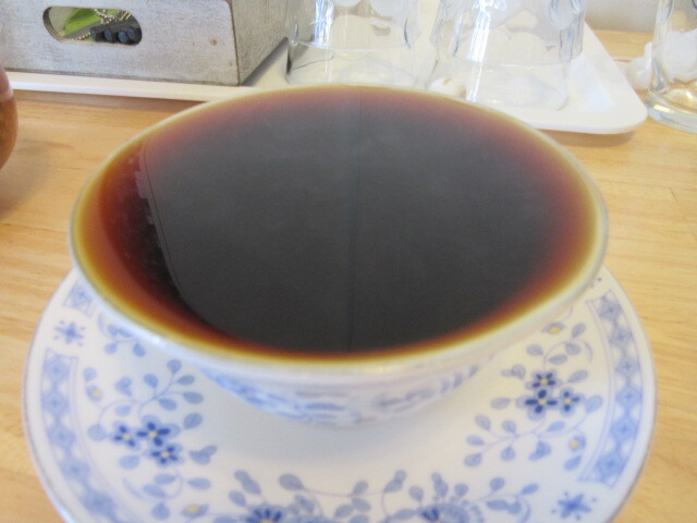 コーヒーはホンジュラスで、カップに、もっきり酒のようになみなみと注いでくれました。こうすると、カップに顔を近づけて飲むので、香りが一層感じられるとのこと。確かにそうですね!ちょっと酸味のある軽めの味でした。コーヒーの表面に写っているのは、天井のライトです。