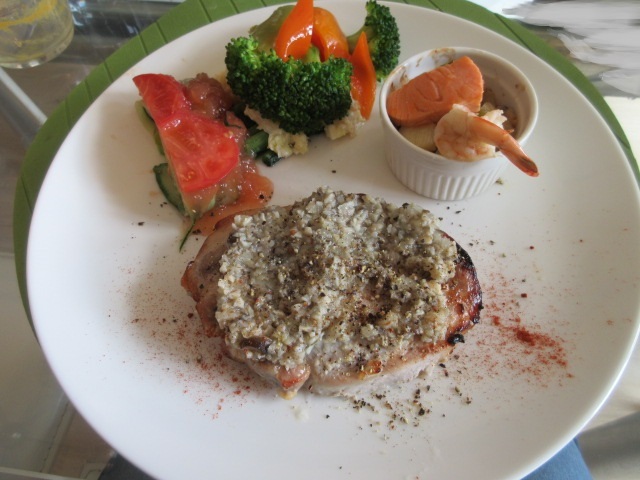 豚肉のソテー(220g)はこんがりと良い焼き色です。お肉の下にはナスとトマトのソースがあり、野菜の食感を残すように、ピューレ状ではなく、大きめにカットしたとのこと。ほんと、野菜のおいしさを感じますね。厚みがあってジューシーな豚肉と合う~。
