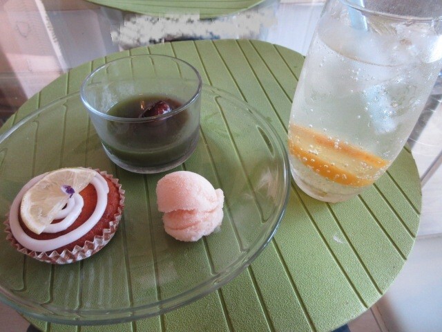 デザートと自家製レモネード。ランチには、デザートとドリンクも付きます。レモネードはお店によって全然味が番うので、メニューにあれば注文します。壱弐参さんのレモネードはホッとする優しい甘さ。カップケーキ、抹茶ゼリー、福島県伊達市の川中島の桃のジェラートとぴったりでした。